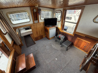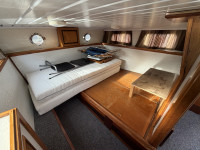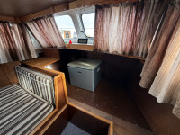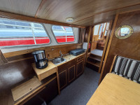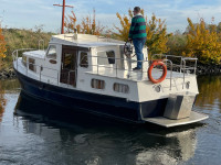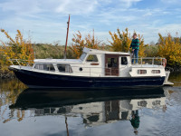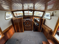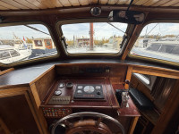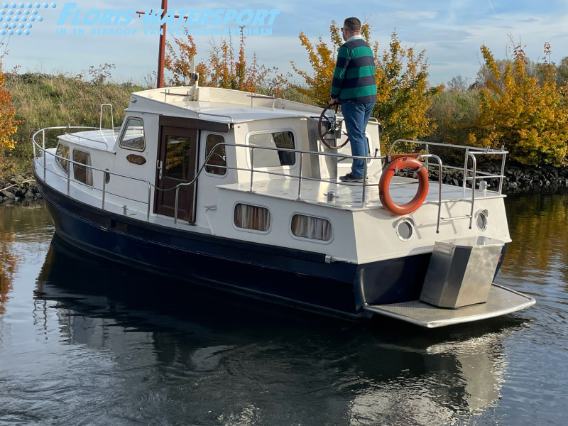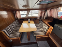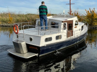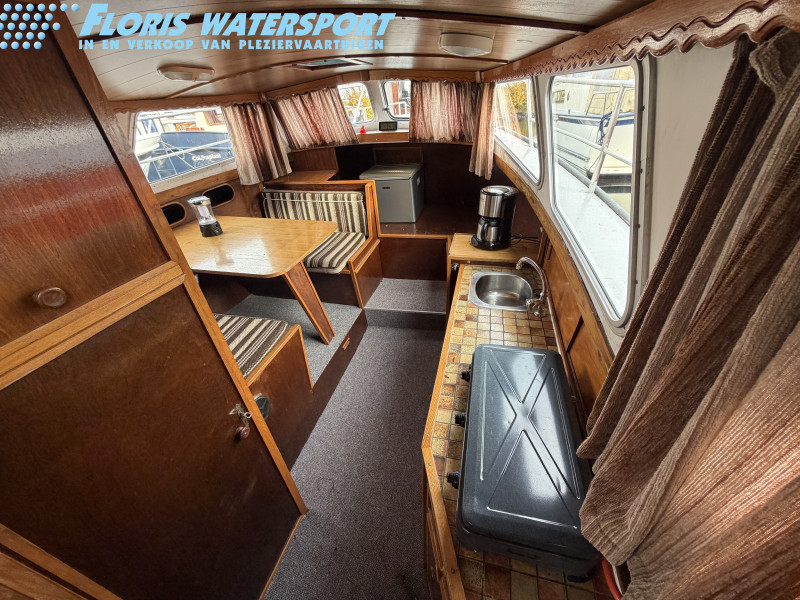 Deze Van Leeuwenschouw heeft een mooie klassieke lijn, die extra wordt geaccentueerd door de kopleguaan. Het is een leuke boot met een dubbele stuurstand. Het achterdek kan wel een likje verf gebruiken. Dankzij de royale breedte is er binnen een prettige leefruimte ontstaan. In het motorruim ligt een Vetus 4-cilinder dieselmotor van 62 pk, ruim voldoende voor deze charmante schuit.